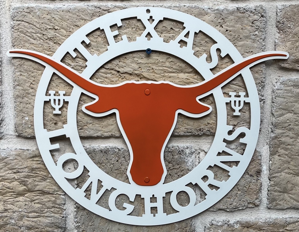 Texas Longhorn sign. The perfect gift for your favorite Texas fan! Metal signs are cut from quality 14 gauge steel, which is roughly the thickness of a quarter. Each sign is cut by a CNC plasma table. The pictures shown are actual customer orders. Orders ship out approximately 5 to 7 business days from order date.